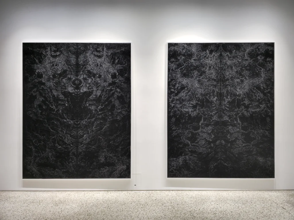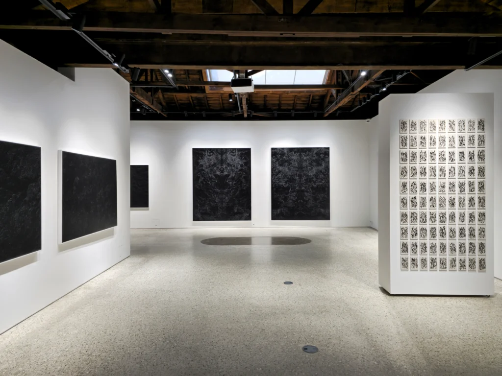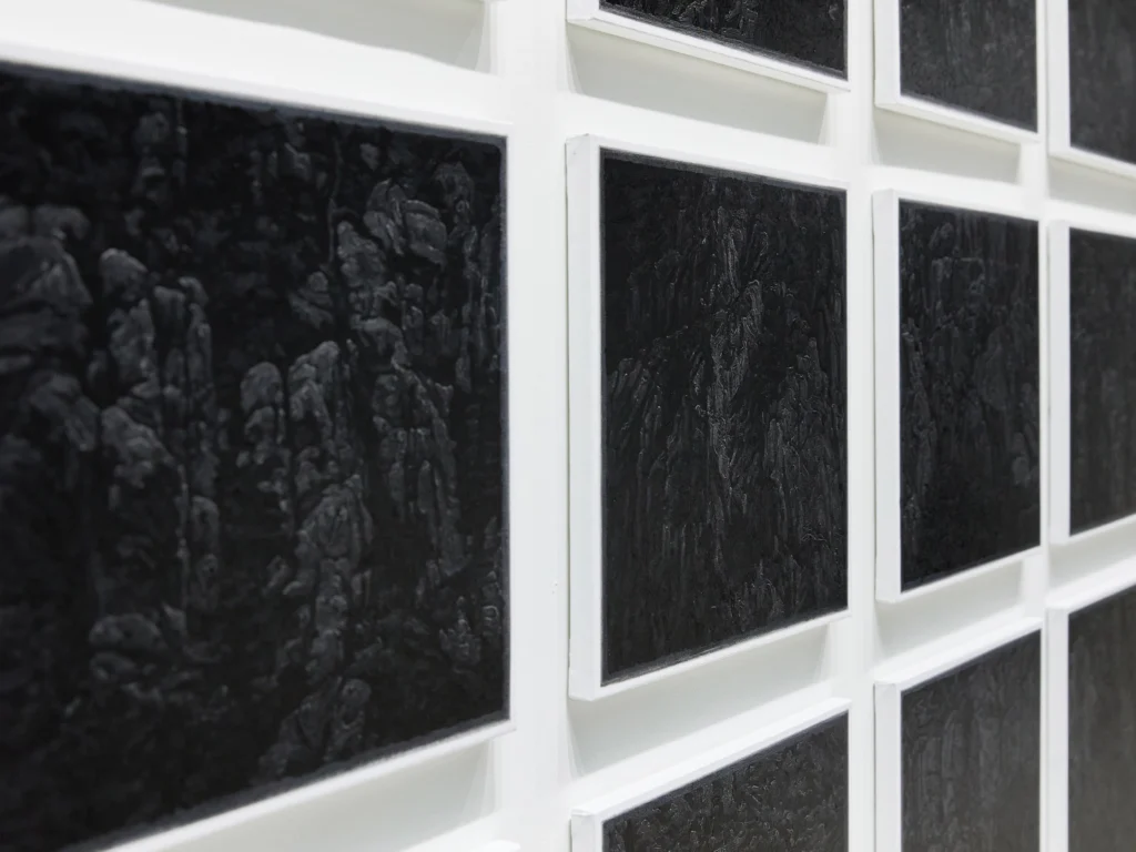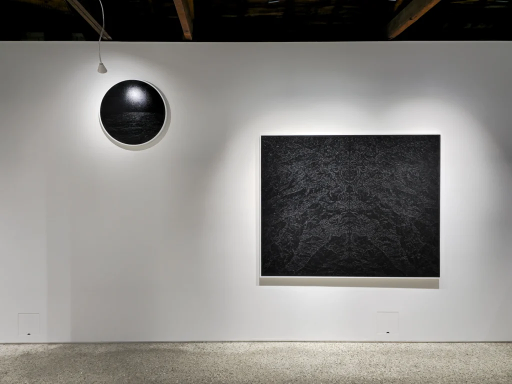 My work aspires to this kind of play—a subtle looseness that allows tension and movement between things. Internally, this play refers to the empty space where visible light dissolves into darkness. Just as countless, spontaneous narratives arise in the mind when gazing at the night sea, I intend for the viewer—when confronted with a black surface stripped of color information—to actively fill and empty that space, a place of hospitality. Externally, it signifies the play between the artwork and the body. At first glance, the painting may appear to be a monochrome black rectangle, yet through its drawn textures and the subtle gloss they create, it pulls the viewer in and then pushes them away again—a space of reflection shaped through movement.