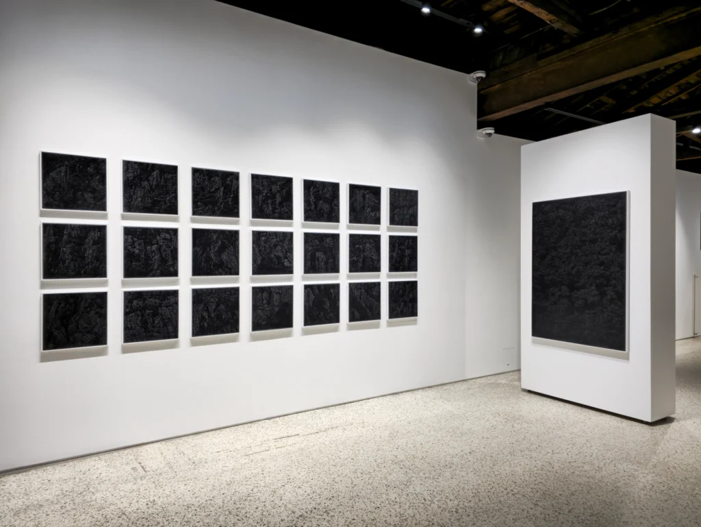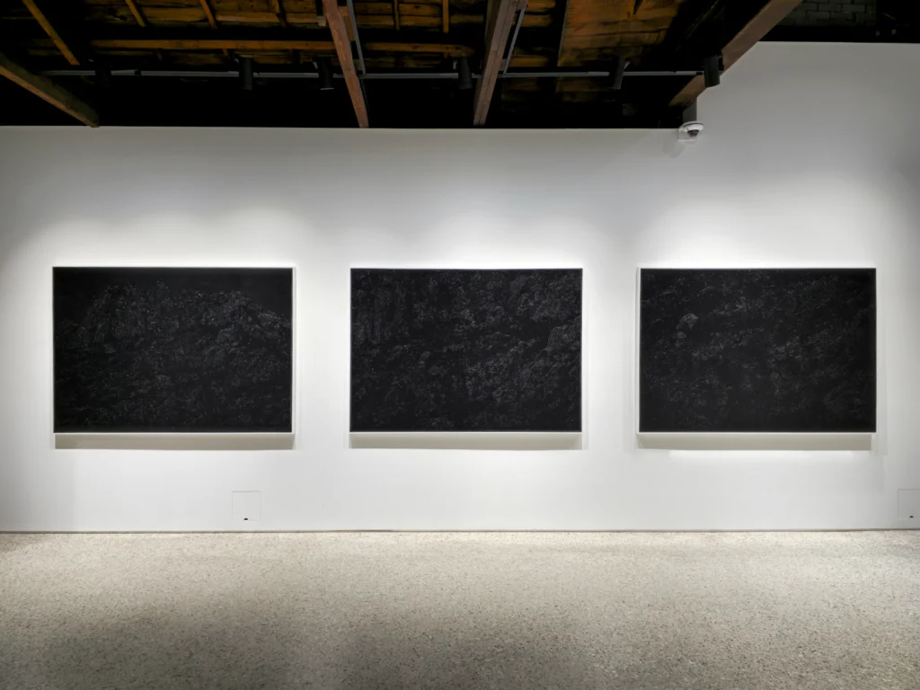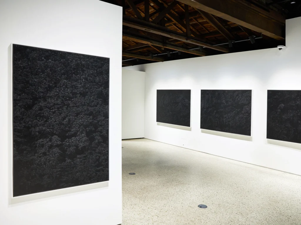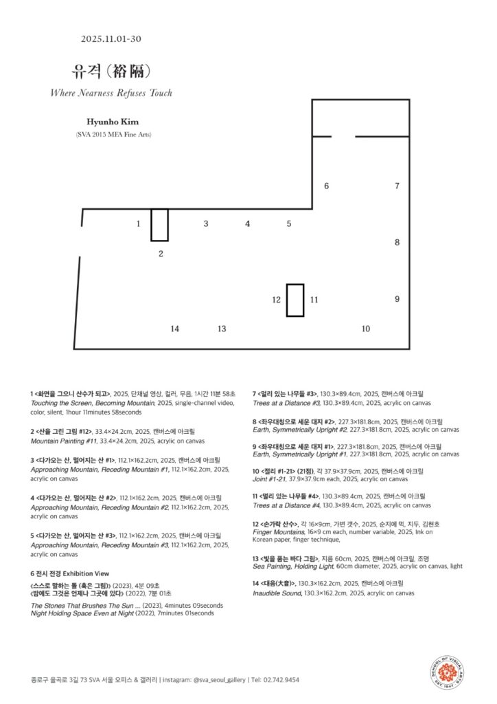 For this exhibition, I have painted subjects such as earth, rock fractures, mountains, and trees—entities that are always connected to us by gravity yet often lost to the inertia of forgetting. Even when light fades and night falls, nature remains there, keeping its distance from us. Likewise, when the lights go out and darkness descends, the painting, as matter, continues to hold its image in silence. The distance at which one can close their eyes and still reach out to touch it—the physical distance that cannot be pinched or zoomed with two fingers—is what situates my painting at the threshold between the virtual and the corporeal.